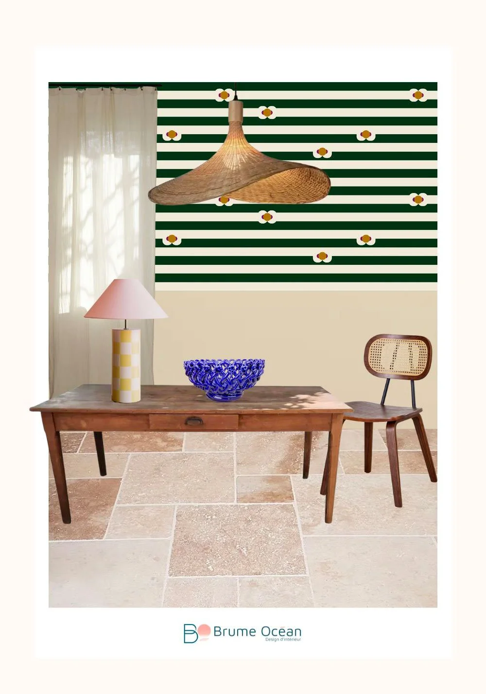 Pour contrebalancer la palette de couleurs du papier peint, je propose sur les autres murs une peinture rose pâle (“Doux Matin” – Maison Janette), délicatement poudrée, qui capte la lumière avec poésie. Le sol en travertin ajoute sa touche minérale et texturée, tandis que les rideaux en voile de lin rayé naturel (Gabrielle Paris) viennent filtrer la lumière tout en douceur.